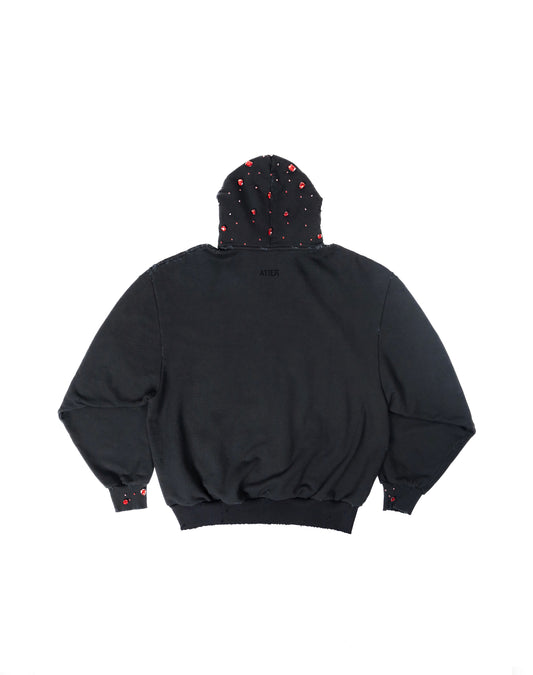 Felpa con strass ricamati a mano su cappuccio e polsini e strass applicati a mano sul retro
